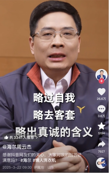 “听劝总裁”——这个网友自发赋予周云杰的标签,已经成为其最具辨识度的符号。在接受新华社采访时,周云杰认为这一标签本质上是网友对海尔尊重用户的一种认可。